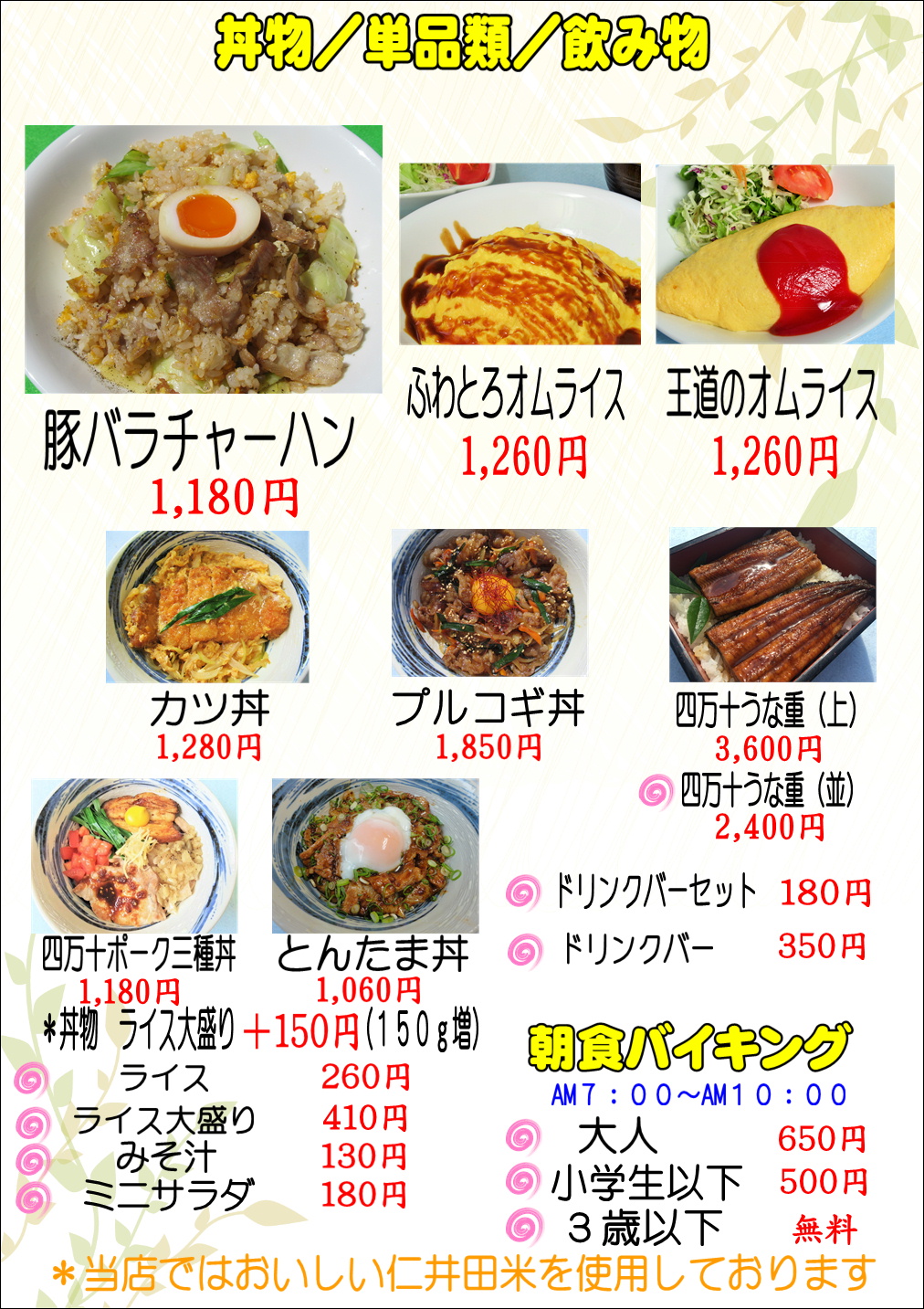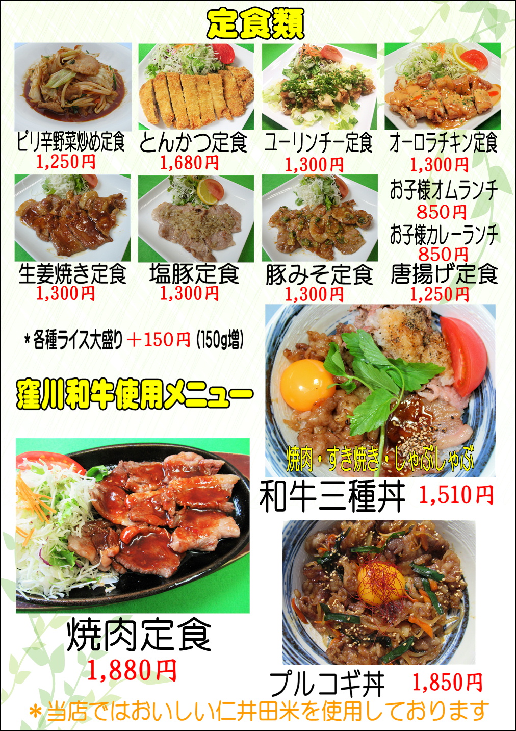 お食事していって下さい! 仁井田米、四万十ポーク、野菜、四万十川のめぐみをたくさん受けて育った安全でおいしい食材を使っています。